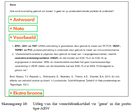 Die data-uitleg van die woordeboekartikels in die prototipe-ARW is ook volgens Du Plessis (2015; 2017) se beginsels saamgestel. Die taakgepastheid van die woordeboek word verseker, aangesien die gebruikerskoppelvlak van die prototipe-ARW geskik is vir die verwerking van kommunikatiewe, kognitiewe en operatiewe take (deur toegang te gee tot 'n "antwoord"/definisie, "notas", "voorbeelde" en "ekstra bronne" (in groen gemerk in skermgreep 10). Verder vertoon die woordeboekartikels bondigheid en opspoorbaarheid deur die data onder elke ikoon in skermgreep 10 eers te versteek, en indien die redigeerder byvoorbeeld besluit om op die voorbeeld-ikoon te klik, word die belangrikste data in vetdruk aangedui (soos geïllustreer in skermgreep 10) sodat die redigeerder nie oorlaai word met data nie (Blom 2021: 86). Die data in die prototipe-ARW se woordeboekartikels word ook konsekwent aangebied deur deurgaans gebruik te maak van dieselfde artikelstruktuur en vertoningsformaat.