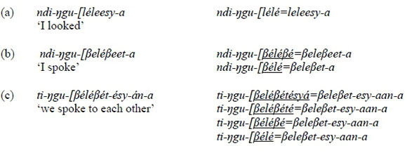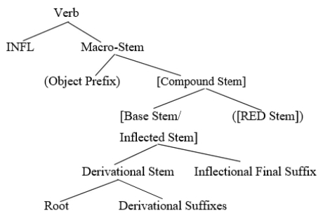 Downing (2003) argues that there is a body of independent evidence from a number of Bantu languages showing that RED is always best analysed as a verb stem forming a compound with the base, rather than as an affix. Downing (1999, 2000) shows that the size of RED is more consistent with that of stems than affixes. For instance, Bantu verb stems are typically minimally bisyllabic. Similarly, RED is minimally bisyllabic in most Bantu languages, even in cases of partial reduplication, and may be several syllables long in languages where total verb stem reduplication is found. In contrast, affixes generally contain at most a single syllable, with a few exceptional bisyllabic forms (see e.g. Doke 1954, 1982; Hyman 1993; and Meeussen 1967 for discussions of Bantu verbal morphology). This size difference is typical of affixes vs. stems: cross-linguistically, affix-like REDs tend to be monosyllabic, while root- or stem-like REDs are longer (McCarthy and Prince 1994). This scenario, as we are going to see in the following sections, is applicable to ciTonga. In the present paper, I assume the verb complex in (4) below.