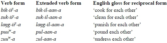 Deletion of liquid onsets before stem-final moras in South-East African Bantu languages is not a completely rare phenomenon. Similar cases have been reported in e.g. Swahili (Polomé 1967:75-76, 84), where liquid onsets to stem-final syllables are usually omitted only to surface when the root is extended, as given in (33) below.