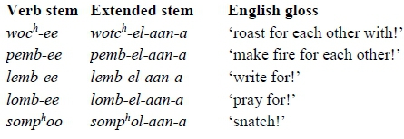 The constituent "Aux" is so called because it fits Steel et al.'s (1981) description of this category; i.e. it consists of a fixed sequence of closed-class items, including those marking tense and/or modality. Myers (1998) thus calls word-internal Aux the "inflectional stem". According to Myers, such a view of the verb converges with proposals made for other highly inflected languages in a variety of language families, such as Navajo, Sekani, the Papuan language Nimboran, and Korean (McDonough 1990; Helpern 1992; Inkelas 1993; and Kim 1992, respectively), where constituency has been argued for and the inflected verb is seen as a compound structure consisting of two stems, one verbal and the other inflectional.