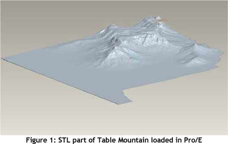 Figure 1 shows the STL file of Table Mountain in Cape Town, South Africa loaded in Pro/E. The DEM ASCII XYZ data of Table Mountain has only the data of the terrain surface. This terrain data was converted into an STL surface; the walls and base were added to it, and the 3D STL part of Table Mountain shown here was obtained.