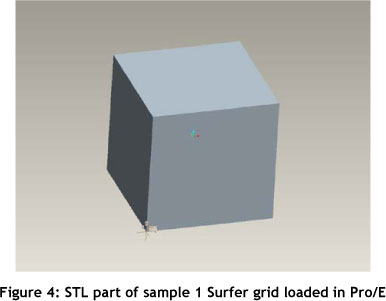 Figure 5 shows the STL part obtained after the conversion of sample 2 of the Surfer grid data. This also has four elevation values. However, the four elevation values are not equal.