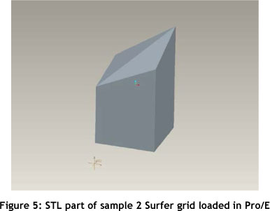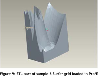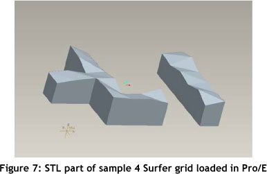 Figure 6 shows the STL part for sample 3 of the Surfer grid data called 'SS3.GRD'. A typical example is created here with several no-data values. The shape of the valid data values is correctly produced The STL file verifies that the elevation values go directly into the vertices of the triangles. It should be noted while viewing the STL part in Figure 6 that the first row of elevation values in SS3.GRD goes to the front of the STL part.