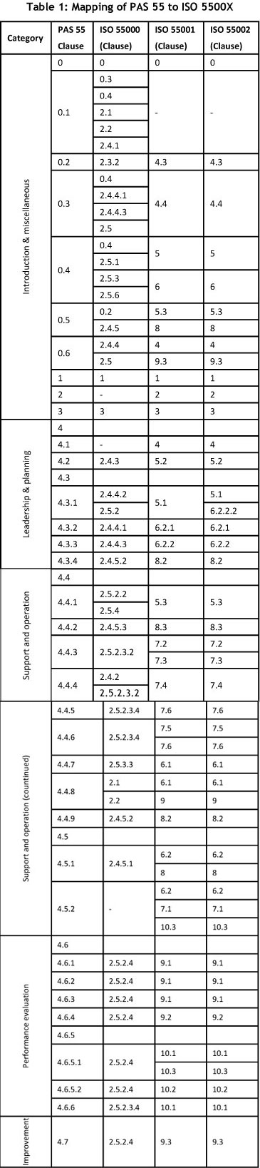 Although there is a mapping of the details between PAS 55, OHSAS 18001, ISO 14001, and ISO 9001 [1], a mapping between PAS 55 and the ISO 5500X suite was not found in the literature. This article is an attempt to map the content and context of PAS 55 to ISO 5500X, both to assist with the transition between the standards, and to identify the sections that are omitted from PAS 55 and the new sections created in ISO 5500X. To get the most out of this article, we recommend that the reader has copies of both PAS 55 and the ISO 5500X suite handy while reading this article; both are readily available on the internet.