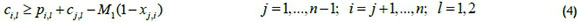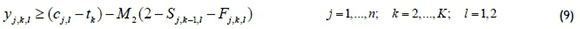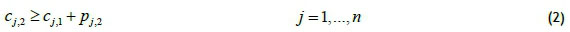 To define a feasible schedule, an approach inspired by Manne [13] is suggested, based on whether a job occurs before others. Let Xj,i be a binary variable equal to one, if job j precedes job i in the sequence (not necessarily immediately before it), and zero otherwise. Also let sj,l and cy be the start time and completion time of each job j on the lth machine respectively. Finally, the constant M1 used in the formulation represents a large positive number. Then constraints (1-6) can be used to sequence jobs in a two-machine flowshop and also determine the start and completion time of each operation.