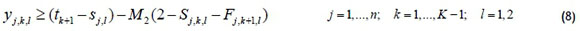 Constraints (7-10) calculate the amount of time each operation occupies at different cost periods. Constraints (11-13) deal with assigning the binary variable of Sj,k,l, and similarly, constraints (14-16) calculate Fj,k,l, which shows if an operation is completed in a period.
