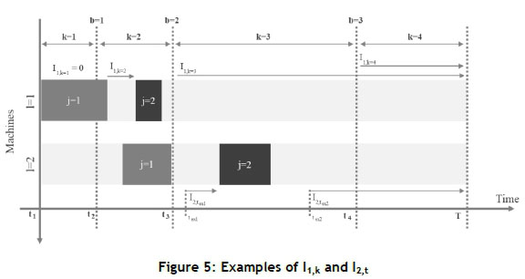 Definition seven. 1h,k: By considering an initial sequence of operations, h,k indicates the amount of idle time between the first idle time on the first machine in the cost interval k ε P and the next operation on the first machine or the end of the programming horizon, whichever comes first. Figure 5 shows the value 1h,k for different cost intervals.