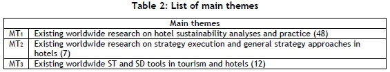 Sixty-eight of the pre-selected publications were submitted to further analysis so as to narrow the search to the most recent publications pertaining to the present work. These 68 publications were chosen on their capacity to provide a thorough understanding of the status of research in SHSE, as well as the present use of ST and SD in hotels and in the tourism industry. These selected papers were grouped under main themes and sub-themes.