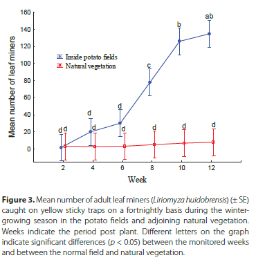 Residuals of data were not normally distributed. There was highly significant interaction effect between fieldxlocationxweek (F5,220 = 17.17, p < 0.01). Leaf miner populations were low during the winter monitoring period. The highest leaf miner abundance was detected between week 10 and 12 after plant emergence, with average trap catches of 126 and 135, respectively. Whereas the natural vegetation had very low leaf miner numbers with the highest mean catches being between week 10 and 12 of 7 and 8 flies. There were a higher number of flies caught in potato fields than in natural vegetation (Figure 3).