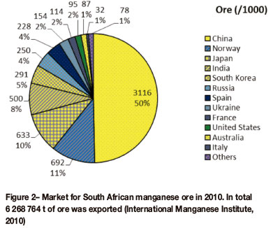 Ore from South Africa is not only beneficiated locally but also exported to international markets. Figure 2 shows the market distribution for South African ore in 2010. In total, 6.3 Mt of ore was exported, with China, Norway, and Japan being the top three importers of South African ore (International Manganese Institute, 2010). It is estimated that 1.1 Mt of ore was beneficiated to high-carbon ferroman-ganese and silicomanganese in the same year.