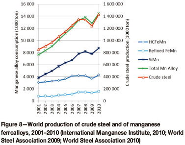 As 90 per cent of the manganese ferroalloys produced worldwide is used in steel, consumption and production closely follow the production of crude steel. For the period 2001-2010 the production of steel increased at a steady rate on an annual basis, except for a decrease in 2009 due to the economic crisis. The consumption of manganese ferroalloys followed steel production closely, as can be seen in Figure 8.