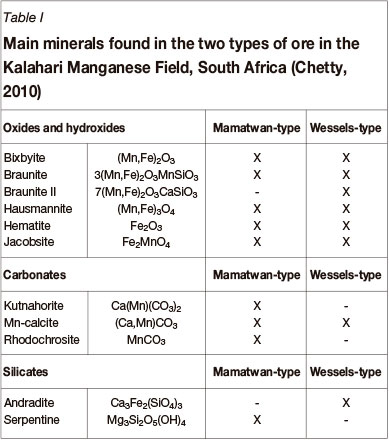 The main minerals found in each type of ore are listed in Table I (Chetty, 2010). The Mamatwan-type ore is rich in oxides, hydroxides, carbonates, and silicates, while the Wessels-type ore - a very complex ore - does not contain significant amounts of carbonates.