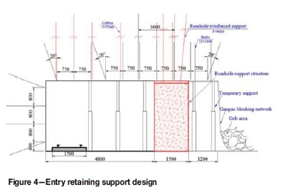 Proper roadway support facilitates the formation of the gob-side entry retaining substructure, which is a basic condition for ensuring entry retaining stability (Bai et al., 2015). Based on actual mine production data, the roadway support plan is finally determined by theoretical calculations combined with field experience. The roadway roof support is based on the 'long/short anchor cable plus bolt plus net' coupling support method plus 'single pillar plus hinged roof-bar'. Support at both sides of the roadway is based on the 'bolt plus net' method. The entry retaining support design is shown in Figure 4.