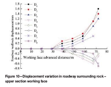Figure 10 shows that before the working face progresses to 38.4 m, the deformation of the roadway surrounding rock is zero. When the face reaches 38.4 m, the roadway surrounding rock starts to displace. As the working face progresses further, the displacement gradually increases, and after measurement points D4 and D5 reach peak values, the displacements then decrease. Before the working face progresses to 72 m, among all roadway roof measurement points, measurement point D2 shows the largest reduction, and measurement point D3 the smallest. When the working face progresses to 72 m, measurement point D1 shows the largest reduction, because before the working face progresses to 72 m, measurement points D1 and D3 are affected by roadway support on both sides, and they show a smaller reduction than measurement point D2. When the working face progresses to 72 m, the right side of the roadway loses support, and the stress reduction at measurement point D1 increases instantaneously. The roadway floor has a smaller displacement than the roof, and measurement point D4 shows the largest displacement, while measurement point D6 shows the smallest. When the working face progresses to 72 m, the right side of the roadway has a developed gob, and the roof fails to reach the floor, which leads to decreases in the displacement at the floor at measurement points D5 and D6. The displacement values at measurement points D7 and D8 at both sides of the roadway increase gradually with the progress of the working face, and the rate accelerates. Overall, the primary mining-induced deformation of the roadway surrounding rock is relatively small, which facilitates roadway maintenance in the stable phase of entry retaining.