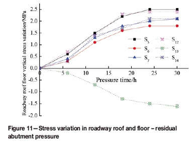 Figure 11 shows that after the upper working face is completed, the residual abutment pressure is adjusted. Over time, the stress in the roadway surrounding rock increases and eventually stabilizes. Among the roof measurement points S5-S7, measurement point S5 has the most significant stress increment and measurement point S6 the least. Measurement point S5 is located in the roof rock immediately above the support structure and receives the most influence from the residual abutment pressure of the gob area, which leads to a significant stress increment. Measurement point S6, in the centre line of the roadway roof, develops a relatively large deformation and releases energy, which leads to relatively small stress variations. Among the roadway floor stress measurement points S12-S14, measurement point S12 has the most significant stress increment (similar to measurement point S5), measurement point S13 has the least significant stress increment (similar to measurement point S6), and measurement point S14 is affected by concentrated stress from the coal wall at the left side of the roadway. The stress at this point gradually increases and eventually stabilizes.