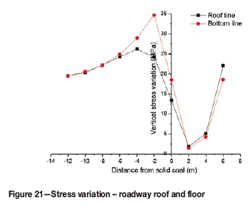 The variation of in stress and displacement on both sides of the retained roadway during mining of the lower panel, are shown in Figures 22 and 23.
