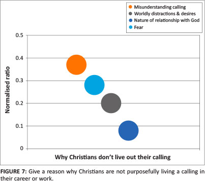 Figure 7 shows that most respondents believe that a lack of understanding of the concept of calling to vocation, or calling to ministry in the world of work, is the primary reason why Christians do not discover and live out their calling in the world of work. Second to this is fear, followed by 'worldly distractions and desires' (greed, personal ambition, etc.) and finally an impoverished spirituality.