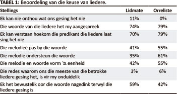 'n Vraag wat aan lidmate en orreliste gevra is, het oor die praktiese aspek van die kommunikasie deur die kerklied gehandel. Die respondente moes nadink oor die liedere wat tydens die laaste erediens wat hulle bygewoon het, gesing is. Daarop kon hulle aandui met watter van 'n aantal stellings hulle saamstem (vgl. Van Rooy 2009:414). Die reaksie word in Tabel 1, Beoordeling van die keuse van liedere, weergegee.