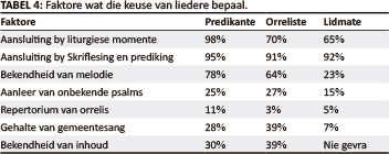 Die predikante, orreliste en lidmate is gevra om te oordeel watter faktore die keuse van liedere vir die erediens bepaal. Hulle kon meer as een moontlikheid merk. Die respons word in Tabel 4, Faktore wat die keuse van liedere bepaal, weergegee.
