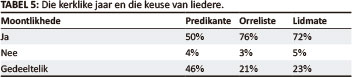 In 'n aparte vraag is gevra of die predikante hulle in die keuse van liedere ook deur die kerklike jaar laat lei. Tabel 5, Die kerklike jaar en die keuse van liedere, is 'n weerspieëling van hierdie respons.