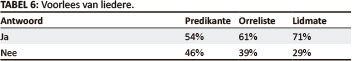 'n Aantal vrae het gehandel oor die voorlees van 'n lied of 'n gedeelte van 'n lied voordat dit gesing word (Van Rooy 2009:447-448). Die predikante is gevra of hulle hierdie praktyk volg en die orreliste en lidmate of hulle dit so verkies. Die respons word in Tabel 6, Voorlees van liedere, weergegee.