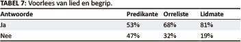Die volgende vraag, wat in Tabel 7 weerspieël word, het gevra of die voorlesing van 'n lied die gemeente help om sodanige lied beter te verstaan. Die respons word in Tabel 7, Voorlees van lied en begrip, weergegee.