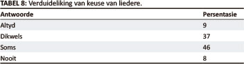 Die predikante se reaksie (Tabel 7) stem ooreen met dié van die vorige vraag (Tabel 6), terwyl die orreliste en lidmate nog sterker daaroor voel. Dit gaan in hierdie reaksie veral oor die beklemtoning van die inhoud deur die voorlesing. Die predikante is ook gevra of hulle die doel waarom 'n sekere lied gesing gaan word, aan die gemeente verduidelik. Die respons word in Tabel 8, Verduideliking van keuse van liedere, saamgevat.