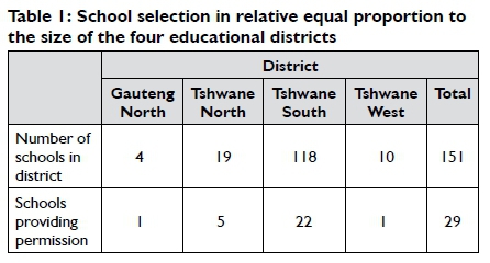 A list of 108 eligible nursery/pre-primary and 43 primary schools, spread across the four educational districts was compiled from various sources (Department of Basic Education (Gauteng), the Yellow Pages, Internet searches, and community-information-search results, obtained from the Tshwane Community Library). A total of 92 schools were contacted randomly by telephone and in relatively equal proportions per district, to request permission to conduct the study at the school. From these 92 schools, 17 schools refused participation, a number of nursery schools were unreachable, some schools did not have children who met the inclusion criteria and other schools had to be excluded since they used dual language teaching. Information was emailed to the remaining 69 schools, of which 29 schools provided permission. These 29 schools comprised two private, two primary and 25 nursery/pre-primary schools.