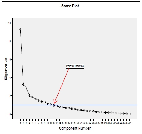 The scree plot confirms the finding of retaining 11 components. As a result, components 12 to 37 are not significant and thus not included for rotation. Table 3 shows the 11 component factors that are meaningful to retain. Factor one explains 25.052% of the total variance; factor two, 8.7685%; factor three, 7.661%; factor four, 5.483%; factor five, 4.962%; factor six, 4.527%; factor seven, 3.999%; factor eight, 3.713%; factor nine, 3.602%; factor ten, 3.096%, and factor eleven, 2.890%.