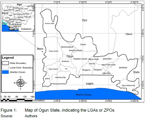 For the purpose of physical planning and other administrative matters, Ogun State is structured into 20 Local Government Areas (LGAs) or Zonal Town Planning Offices (ZPOs) (see Figure 1). These include Abeokuta North, Abeokuta South, Ado-Odo/Ota, Ewekoro, Ifo, Ijebu East, Ijebu North, Ijebu North East, Ijebu Ode and Ikenne. Others are Imeko-Afon, Ipokia, Obafemi Owode, Odogbolu, Odeda, Ogun Waterside, Remo North, Sagamu, Yewa North, and Yewa South. Because of the volume of physical development and for the effective physical planning and development control, the State government created an additional 37 local council development authorities with all the characteristics and functions of the local planning offices.