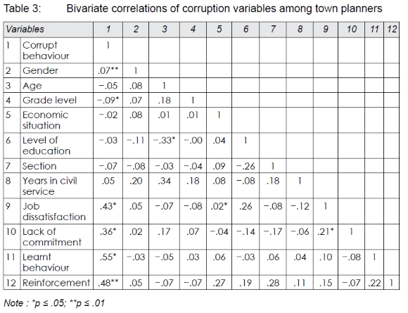 Table 1 shows that the majority (82%) of the respondents are male and older than 41 years of age (61%). The vast majority (85%) of the respondents were either town-planning officers (50%), or senior town-planning officers (35%), and 96% had either a Higher National Diploma/Bachelor Degree (70%), or a Nationa Diploma/Professional Diploma (26%). The profile shows that over half (60%) of the respondents worked in the site-inspection section of their firms. About two-thirds (70%) of the respondents had over eight years' experience in the civil service. This implies that the respondents have adequate tertiary qualifications and experience in the civil service to provide information that could help make useful deductions on the predictors of corruption among selected town planners in the study area.