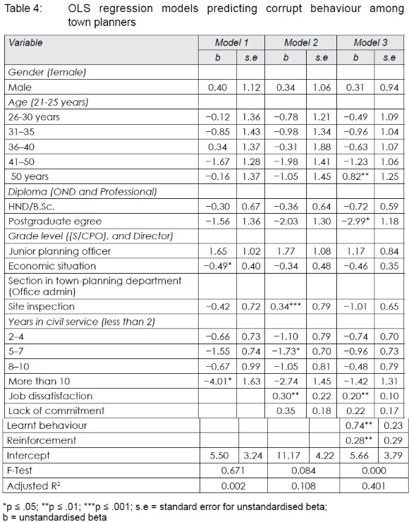 The influence of the control and independent variables on corrupt behaviour was estimated in three different models. The first model in Table 3 shows the influence of gender, age, level of education, grade level, economic situation, planning section, years of service, job dissatisfaction, and commitment on town planners' corruption. The second model includes the same variables as the first model, with the addition of the variables that are considered to promote corruption: job dissatisfaction and lack of commitment. The third model includes the same variables as the second model, with the addition of the social learning variables of learnt behaviour and reinforcement. This stepwise progression has the advantage of identifying any mediating influence of these social learning variables on the effects of economic situation, job satisfaction, and commitment on the act of corrupt behaviour.