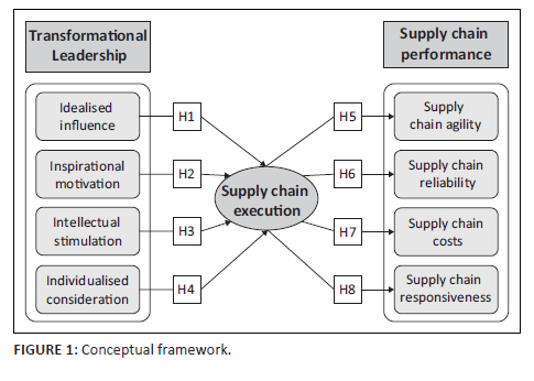 Implementing transformational leadership practices is an essential aspect of strategy execution in many organisations.49,50 The implementation of supply chain strategy is enabled by delegation, supportive, integrative leader-follower relationships and participative aspects that the transformational leadership style develops in organisations.46 Following the investigations on leadership and business performance, it has been observed that transformational leadership practices such as IS and IM can predict the effective development and implementation of business strategy.47,50 Transformational leadership has been strongly associated with organisational outcomes such as SCP and positive financial and non-financial performance.42,50 Considering the aforementioned insights, the following hypotheses are formulated: