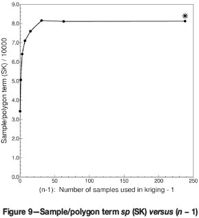 In the case of SK there is of course only the sample/polygon term to correct in the equation for the global kriging variance, since the Lagrange multiplier is absent. The procedure for correcting sp here is very similar to that used for correcting -µ in the case of OK, with only one difference: sp increases with n (see Figure 9) in a manner reminiscent of the way in which Γ(l) increases with l.