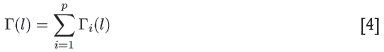 We require the (log)variance as a function of the block side l. As was demonstrated (Figure 3), this function Γ(l) can be faithfully reproduced by a set of nested spherical variogram structures, as given in Equations [3] and [4].