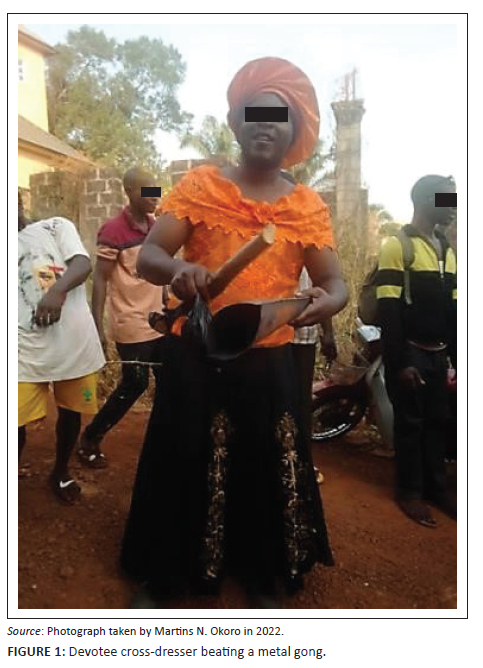In the evening of the same day, devotees gather in groups, wearing different attires. In order to arouse and provoke laughter and make spectators forget their sorrows, a young man cross-dresses, appears in his mothers' dresses and mimics feminine gestures, cat-walks and beats a gong (Figure 1). Also, the village group charged with the responsibility of singing and chanting different songs boasts that their own masquerades will outperform other masquerades of the rival villages. It attests to the fact that 'masking in this sense, is one of an artistic compositions and rivalry between Igbo villages and towns in context of mask theater/spectacle (ihe nkiri)' (Aniakor 2005:15).
