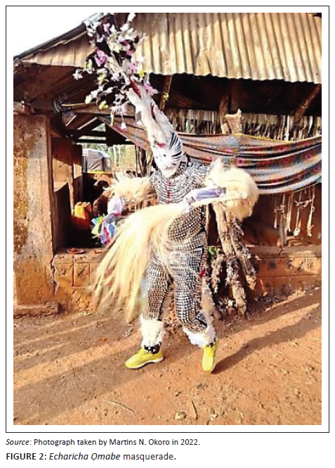 Getting to the groove called Ugwu5 Ọmabe, each village group occupies their own assigned spaces where they prepare for the materialisation of their masquerades. Of note is that at a certain stage towards the preparation, the interests of everybody shift to the Echaricha Ọmabe masquerade (Figure 2), considered to be the major performer in the event through the display of agility and flirting movements. There is no better expression to describe Echaricha than that given by Nwoko (1989), who states that it is 'the principal Ọmabe masquerade that expresses the concept of mystifying beauty, divine radiance, ideal probity and immense wealth'.