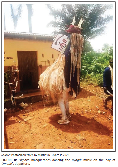 It is at this point that the initiated, without looking back, head back home, singing the song entitled 'wὸlὸlὸ wὸlόlόlό wὸlὸlὸ wό lόlόόόό'. Upon hearing this song, their wives back home prepare buckets of water in the façade for the initiated to bathe before entering the house. Inside the house, palm oil is applied on their legs in order to ward off the Ọmabe spirit, ensuring that the safety of their households is guaranteed (Okoro 2022). One remarkable thing about this tradition is that on the following morning, there is jubilation all over the town in celebration of the successful completion of the rituals. Relatives, friends and well-wishers pay visits to the initiated and offer them gifts such as fowls, tubers of yam and other food items, expressing their happiness. Those who have become whole seize the opportunity to share testimonies.
