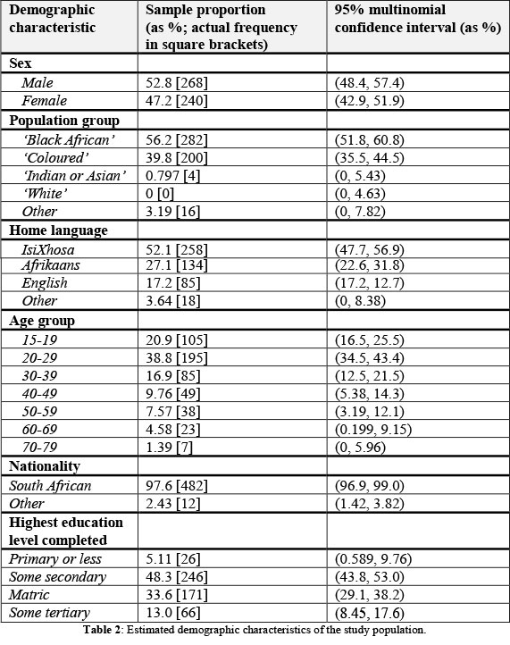 The Pearson chi-squared test for independence was used to check for an association between religious affiliation and other demographic variables (sex, education level, population group). No association was found between religious affiliation and sex (p-value=0.15) or between religious affiliation and education level (p-value=0.24). However, a strong association was found between religious affiliation and population group (p-value=7.2x1027). Specifically, 100% of respondents who self-identified as African Traditional Religion were 'Black Africans' and 86% of respondents who self-identified as Muslim were 'Coloureds'. Respondents self-identifying as Christian were more evenly divided between population groups.