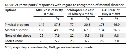 Considering all these facts, one questions how much South Africans know about mental disorders. Consequently, this study aimed to describe the mental health literacy of three common psychiatric disorders, namely generalised anxiety disorder, schizophrenia and major depressive disorder (MDD) in a region in South Africa. According to the South African health and stress study (SASH), anxiety disorders were found to be the most common with a prevalence of 13%. Mood disorders were found to have a prevalence of 9%.27 The prevalence of schizophrenia, a psychotic disorder, was not assessed in the SASH study but has a prevalence of about 1% worldwide.29