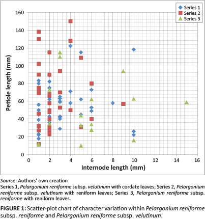 Character variation was plotted on a scatter plot chart (Figure 1), which shows that all variation overlaps in both subspecies. This implies that these characters cannot be used to distinguish the two subspecies. The petiole length of subspecies velutinum overlaps completely with that of subspecies reniforme and this characteristic is therefore also not useful to distinguish the two subspecies. Most of the specimens with characteristics that correspond with subspecies velutinum have cordate leaves; although, there are a few that are reniform. All specimens corresponding to subspecies reniforme have reniform leaves. Figure 1 shows that variation in the leaf shape is not correlated with petiole length or internode length and therefore this character is too variable to reliably be used to distinguish subspecies.