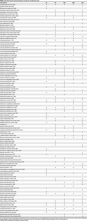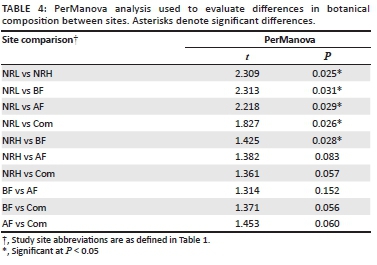 In support of the findings from the pairwise PerManova (Table 4), 37.7% of species occurred in only one management type (NRL). Only 3.51% and 7.89% of species were unique to NRH and BF, respectively. Two species found in the study area (Eucomis autumnalis Chit. 1951 and Hypoxis hemerocallidea Fisch 1842, both in AF and NRL) are currently threatened (Raimondo et al. 2009). One species, Plantago myosuros Lam. 1972 (in AF and Com), is an exotic weed from South America. A large number of increaser and pioneer species are present in the system (Table 5), as illustrated by the species that are confined to high disturbance areas, including the AF and Com sites. Two species were restricted to the conservation area and one of these was most abundant in the area that was heavily grazed by indigenous herbivores (NRH).
