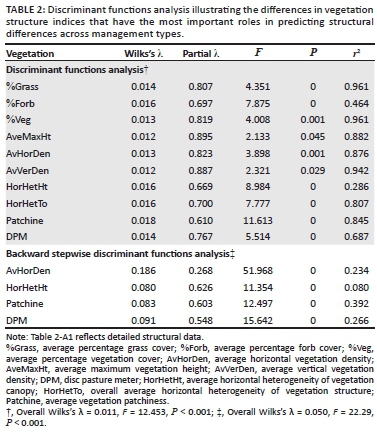 To assess the response of vegetation structure to management, it was important to understand which of the measured structural indices were most sensitive to the disturbance effects and which one could act as a surrogate for overall vegetation structure. When all 10 of the structural indices were included in the analysis (Table 2), any of the indices could have been used to differentiate between management practices but some were more effective than others. For this reason, a stepwise analysis was required to identify the most effective indices for sampling grassland structure.