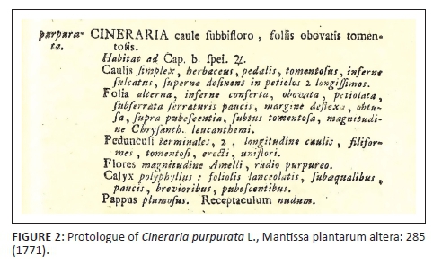 The identity of Cineraria purpurata L. (1771) has remained uncertain until now. It was described by Linnaeus from one of over 200 specimens of Cape plants sent to him by the Governor at the Cape, Rijk Tulbagh (1699-1771), appointed to the post in 1751. Tulbagh had an abiding interest in natural history, and letters in the Cape Archives attest that he regularly sent staff members of the Company's garden into the interior 'ter opsoeking en versameling van Planten, gewassen, kruidjen en Insecten' ['to search for and collect plants, crops, herbs and insects'] (Glenn & Germishuizen 2010). Although relatively detailed for the time, the description provided by Linnaeus (1771) was certainly not enough to identify the species on its own, and the name was subsequently included by De Candolle (1836) amongst the 11 species of Cineraria that were inadequately known to him. The name then disappeared from the botanical literature, and it is not cited by Harvey (1865) in his treatment of the family for the Flora capensis. It reappears as one of the species excluded from Cineraria L. by Cron et al. (2006) in their revision of the genus, where they lectotypify it against Tulbagh 44 in the Linnean Herbarium (LINN) but without further comment as to its identity. Although now linked to a specimen, the application of the name remained uncertain (Jarvis 2007) until we examined the type and recognised it as the species currently known as Mairia hirsuta DC.