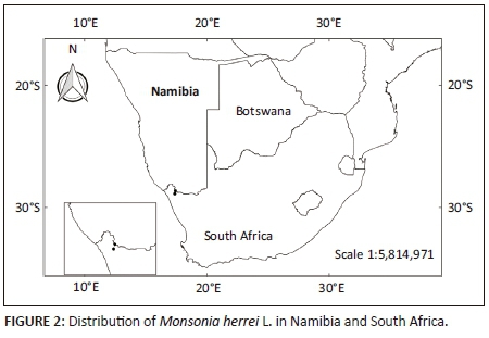 Monsonia herrei (L.Bolus) F.Albers (Geraniaceae) is a fleshy, short sub-shrub commonly known as Bushman's candle (Verhoeven, Venter & Van Rensburg 1983). The genus Monsonia is found throughout Africa and south-west Asia, but the majority of the species occur in southern Africa (Miller 2003). Klaassen and Kwembeya (2013) record 11 species occurring naturally in Namibia. Based on the localities obtained from the National Botanical Research Institution (NBRI), the distribution of Monsonia is concentrated more in the southern part of the country (Figure 1) although a few records extend from central to north-west Namibia into the Kaokoveld Centre of Endemism, which is also botanically poorly explored (Swanepoel 2013).