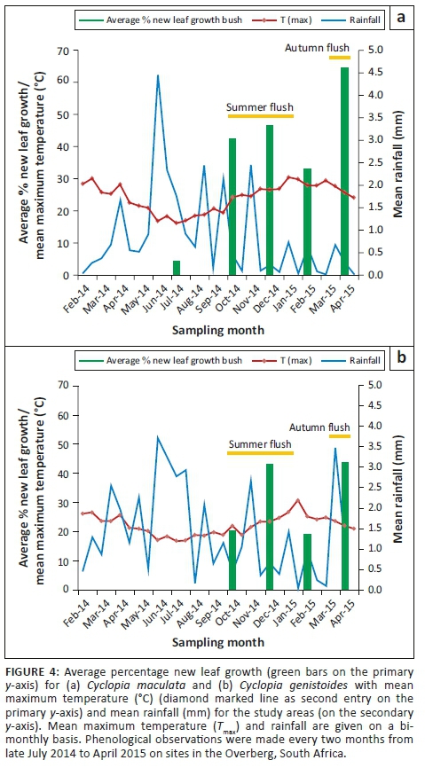 The high degree of similarity between the phenologies of C. maculata and C. genistoides, despite their distinct life history traits, suggests some level of internal or endogenous cue for phenology transition. The potential of inherent cues in flowering events in Fynbos species was first recorded in the 1980s when transplanted Protea species maintained their natural flowering period despite being removed from their accustomed climatic conditions (Vogts 1982 in Pierce 1984). Similarity in the two Cyclopia species phenologies showed synchrony with prevailing weather conditions observed at both study areas, where rainfall and temperature showed similar trends. Further in-depth phenology studies are needed to determine the causal relationships between phenological phases, internal cues and climatic conditions for the Cyclopia genus. It would be especially insightful if co-occurring Cyclopia spp. of the same known age could be compared over time.