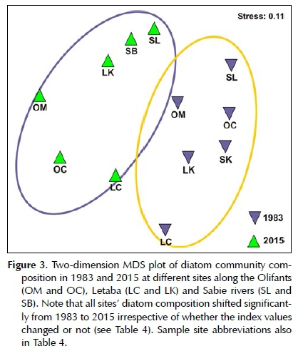RESULTS: Diatom community structure was significantly different between 1983 and 2015. Diatom-based index scores (SPI) indicated an improvement in water quality for the Letaba and Olifants rivers.