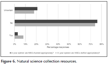 The results indicated that respondents believed that the most important roles of NSCs were also the areas in which they should focus and improve on in future. These included collection care and conservation, documenting biodiversity, availability of taxonomic expertise, collecting new specimens and making data openly accessible. This echoes the views of curators who see 'the collections as serving a scientific and research purpose rather than a cultural or historical purpose, with taxonomic research and reference collection or identification value rated as the most important functions of the collections, and cultural, aesthetic, and tourism value rated as the least important' (Hamer 2012:2).