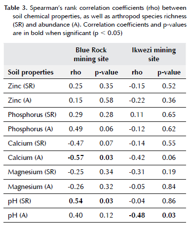 Species richness and abundance of arthropods did not correlate with most soil chemical properties (except for calcium and pH) (Table 3). At Blue Rock mining site, a negative correlation (rho = -0.57, p = 0.03) between calcium and arthropod abundance was recorded (Table 3). A positive correlation (rho = 0.54, p = 0.03) between arthropod species richness and soil pH was recorded at Blue Rock mining site (Table 3). Arthropod abundance was negatively correlated with soil pH (rho =-0.48, p = 0.03) at Ikwezi mining site (Table 3).