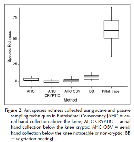 Like Nsengimana et al. (2017), the current study observed the lowest effect on the mean variation of species richness in aerial hand collection, below the knee cryptic, and non-cryptic active sampling techniques (Figure 2 and 3). The major disadvantages mentioned by several studies are linked to the ant and spider size as larger individuals are easier to identify (Privet et al. 2020).